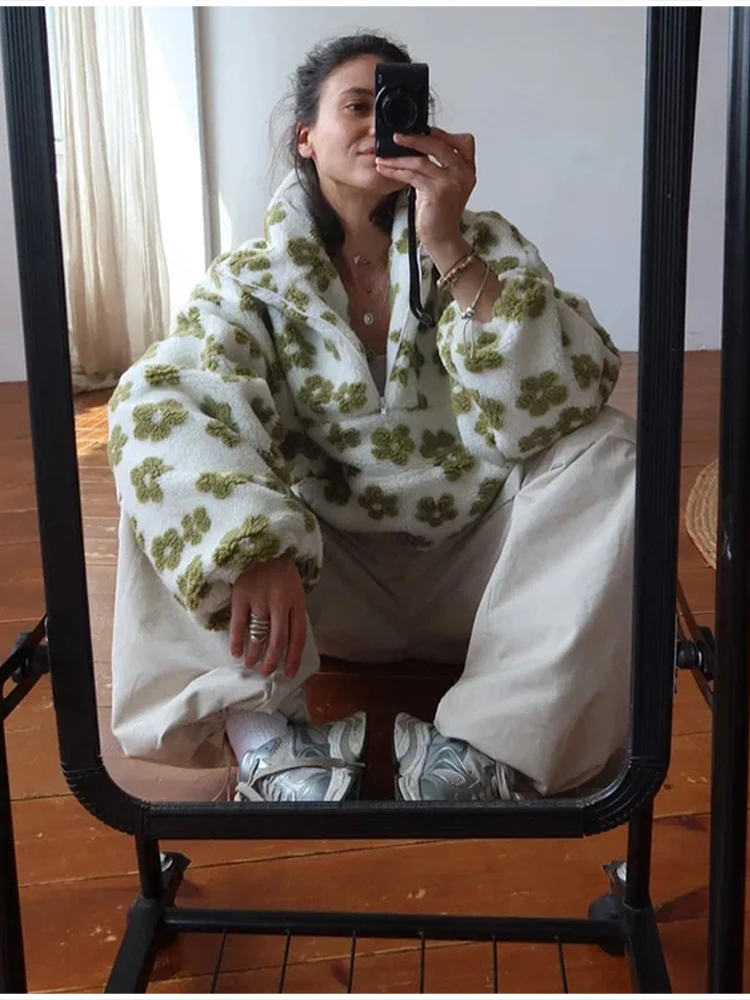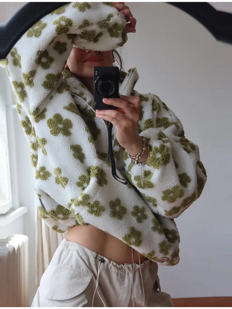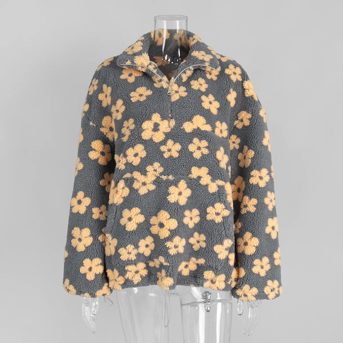 Autumn Faux Lamb Fur Floral Pullover Hoodies Half Zip Style Fit Warm Stylish Sweatshirt 2025 NEW Lady High Street Y2K Outwears